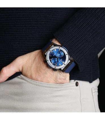 Montre chronographe d’homme en titane, cadran bleu 2 compteurs avec index appliqués, affichage de la date par guichet à 6 heures, lunette stylisée à décor de vis. Fond de boîte transparent dévoilant son mouvement automatique. Bracelet neuf en caoutchouc bleu avec boucle déployante réglable en acier. Signée et numérotée.