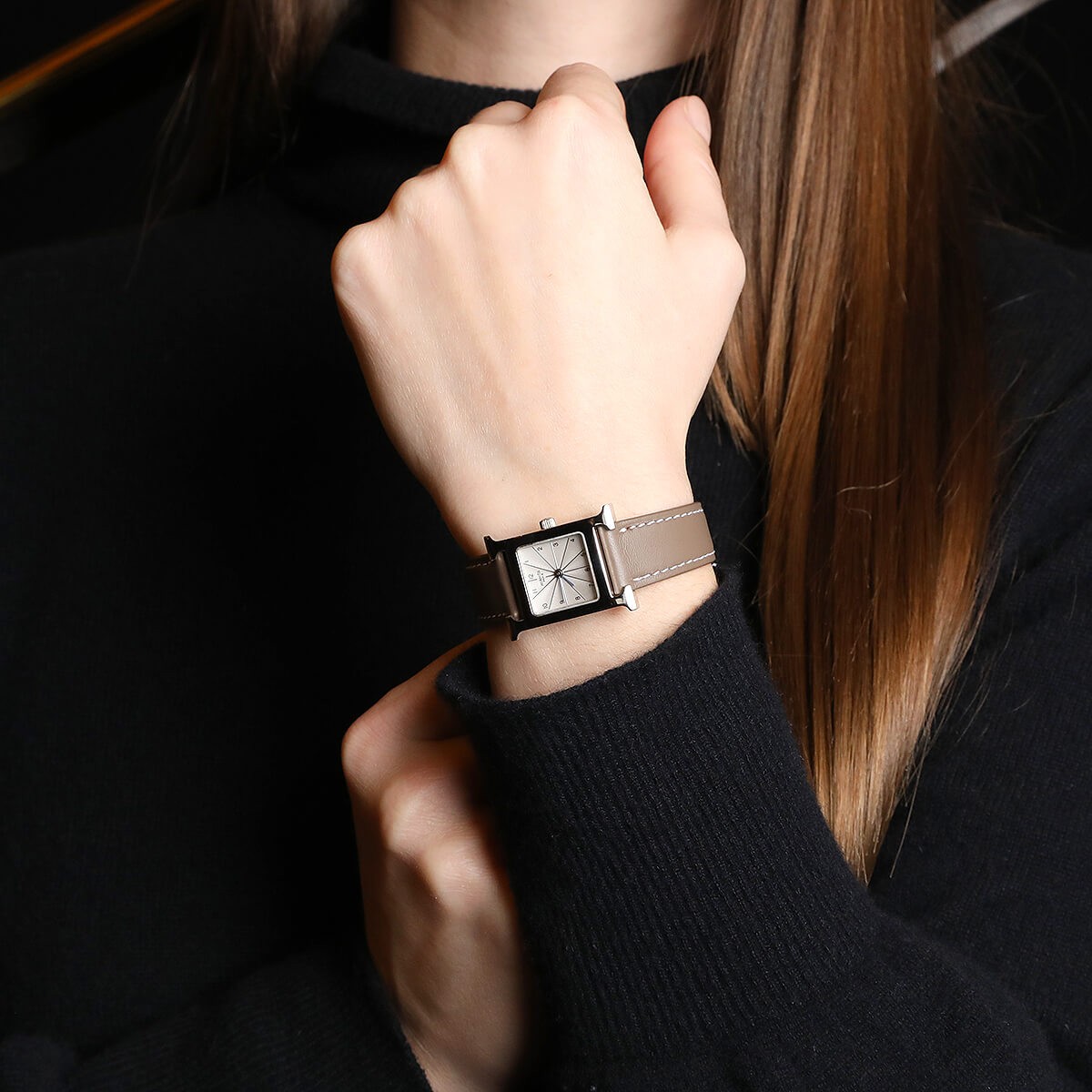 Montre bracelet de femme petit modèle en acier, cadran argenté stylisé avec chiffres arabes, lunette à décor de ''H''. Bracelet neuf rapporté non signé en cuir couleur taupe avec boucle ardillon en acier signée. Signée et numérotée.