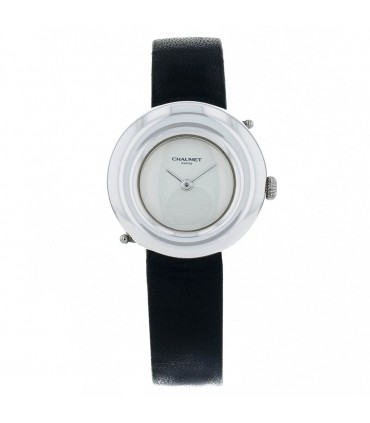 Montre bracelet de femme en argent, cadran crème stylisé, lunette à décor de godron. Mouvement quartz. Bracelet interchangeable usagé en cuir bleu avec boucle ardillon. Signée et numérotée.