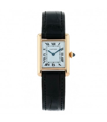 Montre bracelet de femme en or jaune, cadran blanc avec chiffres romains peints, chemin de fer pour les minutes. Mouvement mécanique. Bracelet neuf rapporté en crocodile noir avec boucle déployante en or jaune. Signée et numérotée.