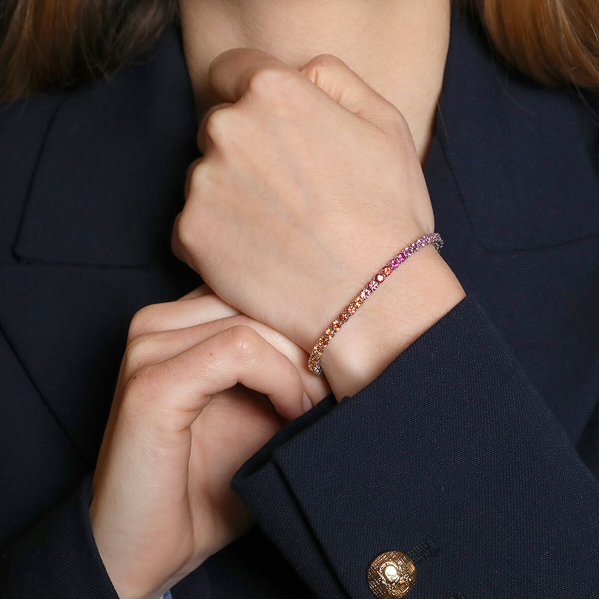 Bracelet en or blanc, composé d’une ligne arc-en-ciel de saphirs de différentes couleurs en serti griffe, agrémenté d’un fermoir invisible à cliquet avec sécurité.