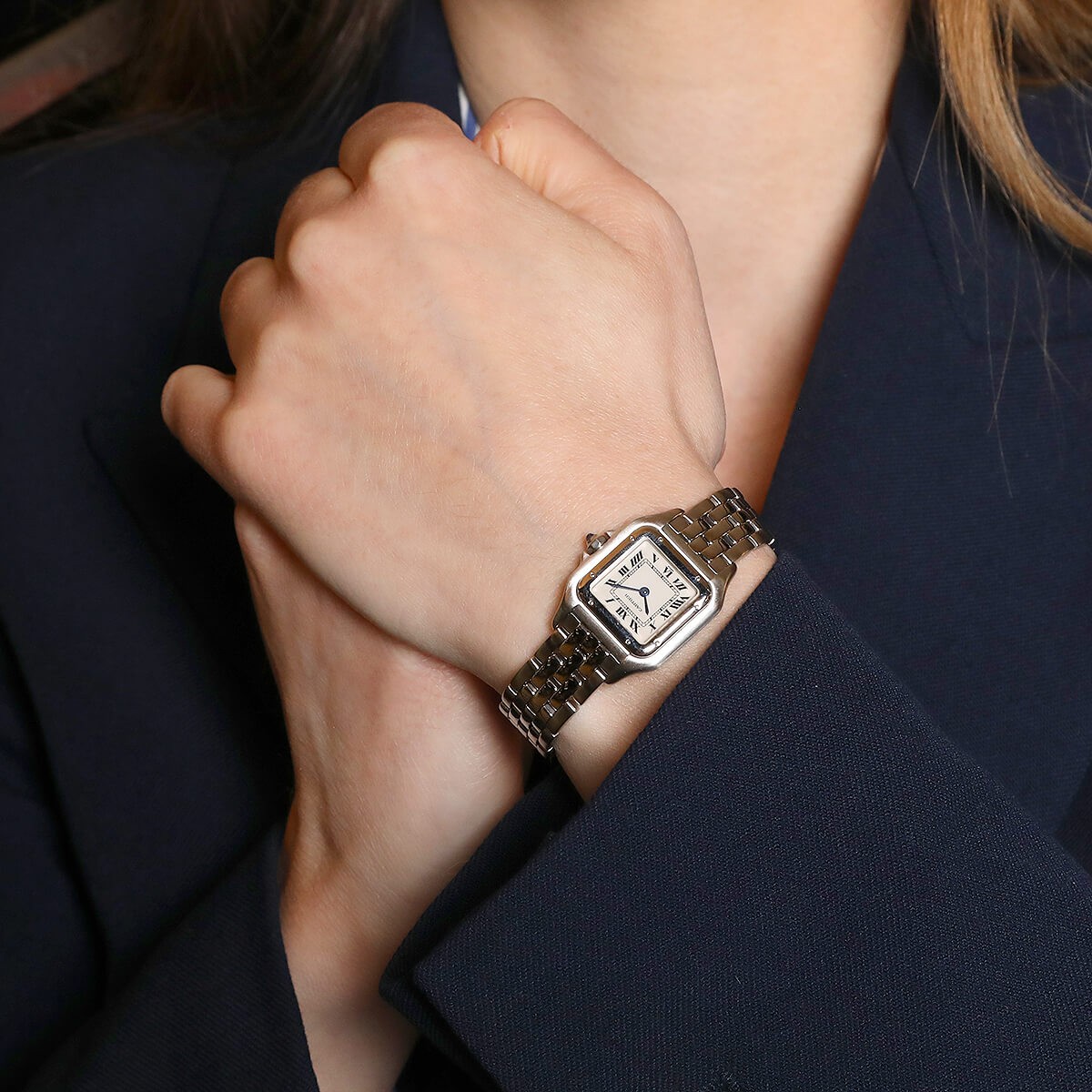 Montre bracelet de femme petit modèle en acier, cadran argenté avec chiffres romains peints, chemin de fer pour les minutes. Mouvement quartz. Bracelet en acier, maillons articulés avec boucle déployante en acier. Signée et numérotée.