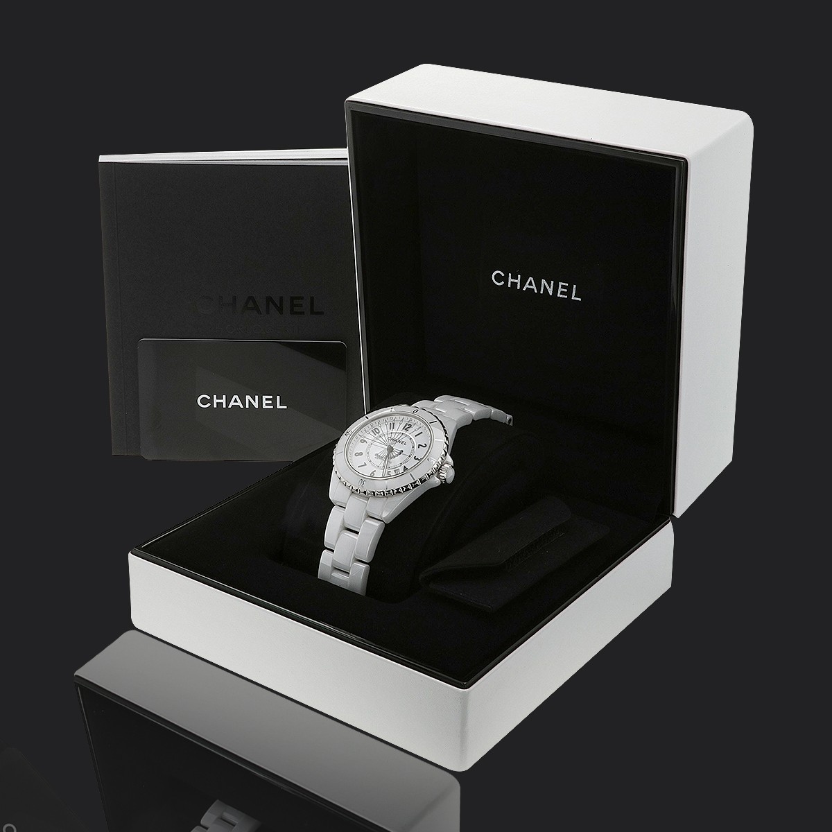 Montre bracelet en céramique blanche, cadran blanc avec chiffres arabes appliqués, chemin de fer pour les minutes, affichage de la date par guichet à 4 heures 30, lunette tournante graduée. Fond de boîte transparent dévoilant son mouvement automatique. Bracelet en céramique blanche, maillons articulés avec boucle déployante en acier. Signée et numérotée.