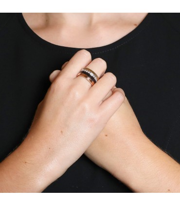 Bague large 4 tons d'or, stylisant 4 anneaux travaillés en relief aux motifs lisse poli, clous de Paris en PVD marron, godrons et ligne de diamants. Signée.