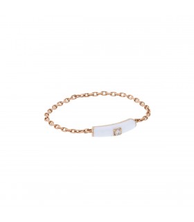 Bague en or rose, composée d’une fine chaîne maille forçat retenant un motif en émail blanc serti d’un diamant. Signée.