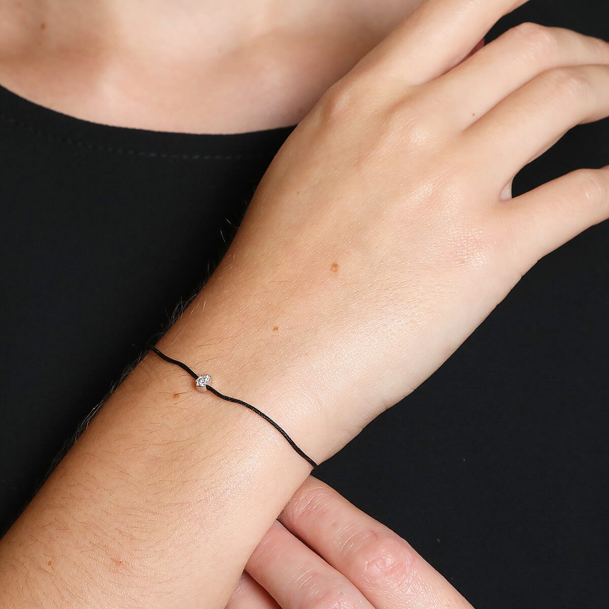 Bracelet en cordon noir et or blanc, orné d’un motif en poire coulissant serti de diamants. Longueur réglable. Signé.