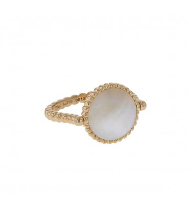 Bague en or jaune, à décor perlé rehaussé d’un motif “rose des vents” orné d’une pastille de nacre et ponctué d’un diamant. Signée et numérotée.