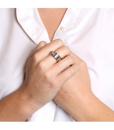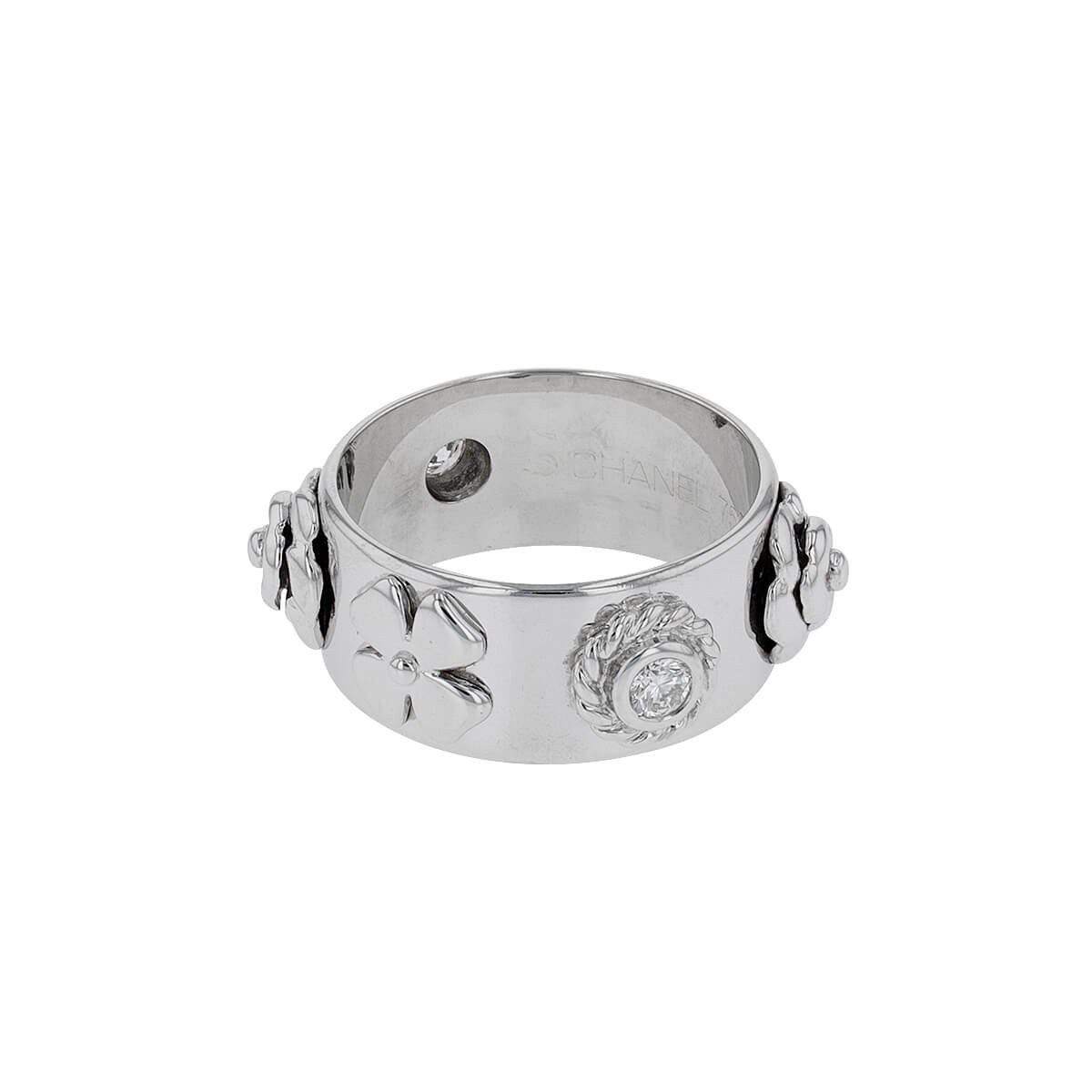 Bague en or blanc, ponctué de motifs de trèfles, de camélias et de deux diamants d’environ 0,1 ct en serti clos. Signée et numérotée.