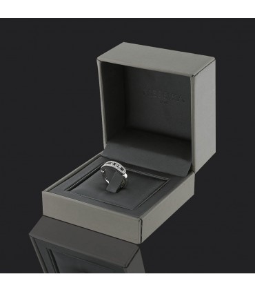 Bague en or blanc, à décor ajouré orné de 3 diamants mobiles dans un entourage de diamants. Signature ponctuée d’un diamant.