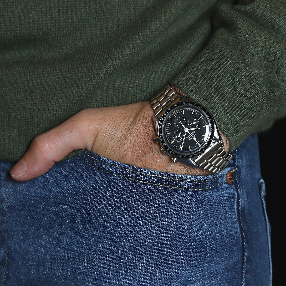 Montre chronographe en acier, cadran noir 3 compteurs avec index, lunette rehaussée d’un tachymètre jusqu’à 500 units par heure. Fond de boîte transparent dévoilant son mouvement mécanique. Bracelet en acier, maillons articulés avec boucle déployante réglable en acier. Signée et numérotée.