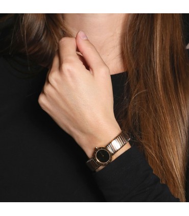 Montre bracelet de femme 3 tons d’or, cadran noir avec chiffres arabes et index appliqués, lunette gravée Bvlgari. Mouvement quartz. Bracelet flexible 3 tons d’or, maille Tubogas. Signée et numérotée.