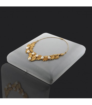 Collier en or jaune, à décor de feuillages ponctué de sept perles de culture d’environ 8mm de diamètre. Signé.