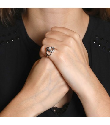 Bague en or blanc, ornée de trois ronds entremêlés, l’un serti de diamants et retenant un diamant mobile. Signée et numérotée.