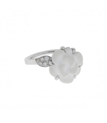 Bague en or blanc, ornée d'une agate blanche sculptée stylisant un camélia, sa feuille rehaussée de diamants. Signée et numérotée.