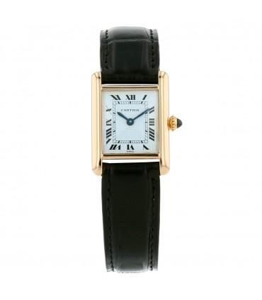 Montre bracelet de femme en or jaune, cadran blanc avec chiffres romains peints, chemin de fer pour les minutes. Mouvement mécanique. Bracelet neuf rapporté en crocodile noir avec boucle ardillon en métal doré. Signée et numérotée.