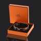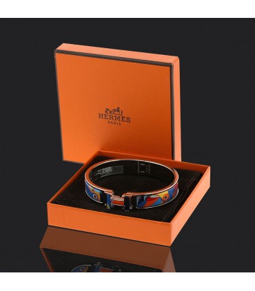 Bracelet en acier, centré d’un fermoir en forme de H épaulé de deux bandes d’émail multicolore figurant des toucans. Signé et numéroté.