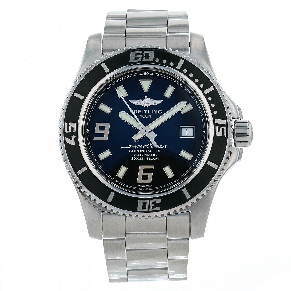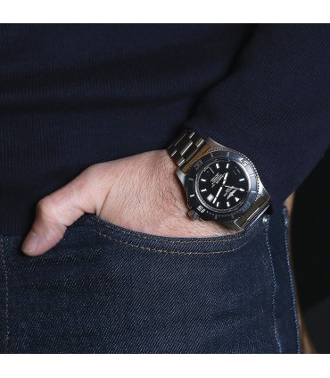 Montre bracelet d’homme en acier, cadran noir avec chiffres arabes et index luminescents, chemin de fer pour les minutes, affichage de la date par guichet à 3 heures, lunette tournante graduée en acier et caoutchouc. Mouvement automatique. Bracelet en acier, maillons articulés avec boucle déployante réglable en acier. Signée et numérotée.