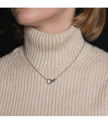 Collier en or blanc, maille forçat, centré de 2 anneaux entrelacés à décor de vis. Signé et numéroté.