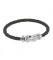 Bracelet jonc ouvert en or blanc, centré d’un motif ovale ajouré retenant deux chaînes ponctuées d’un diamant. Signature suivie d’un diamant.