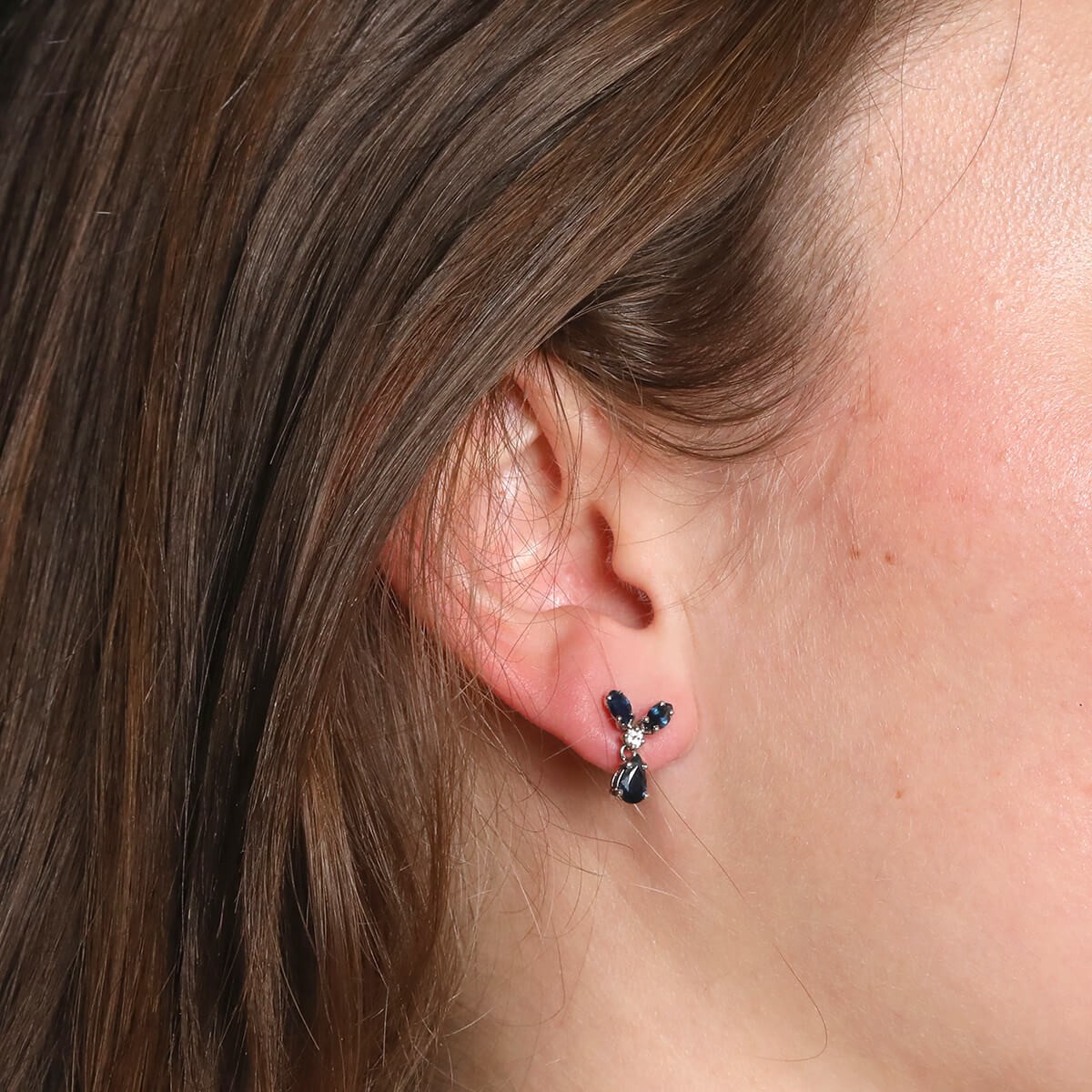Boucles d’oreilles en or blanc, serties de deux saphirs taille navette et d’un diamant rond facetté retenant en pampille un saphir taille poire.