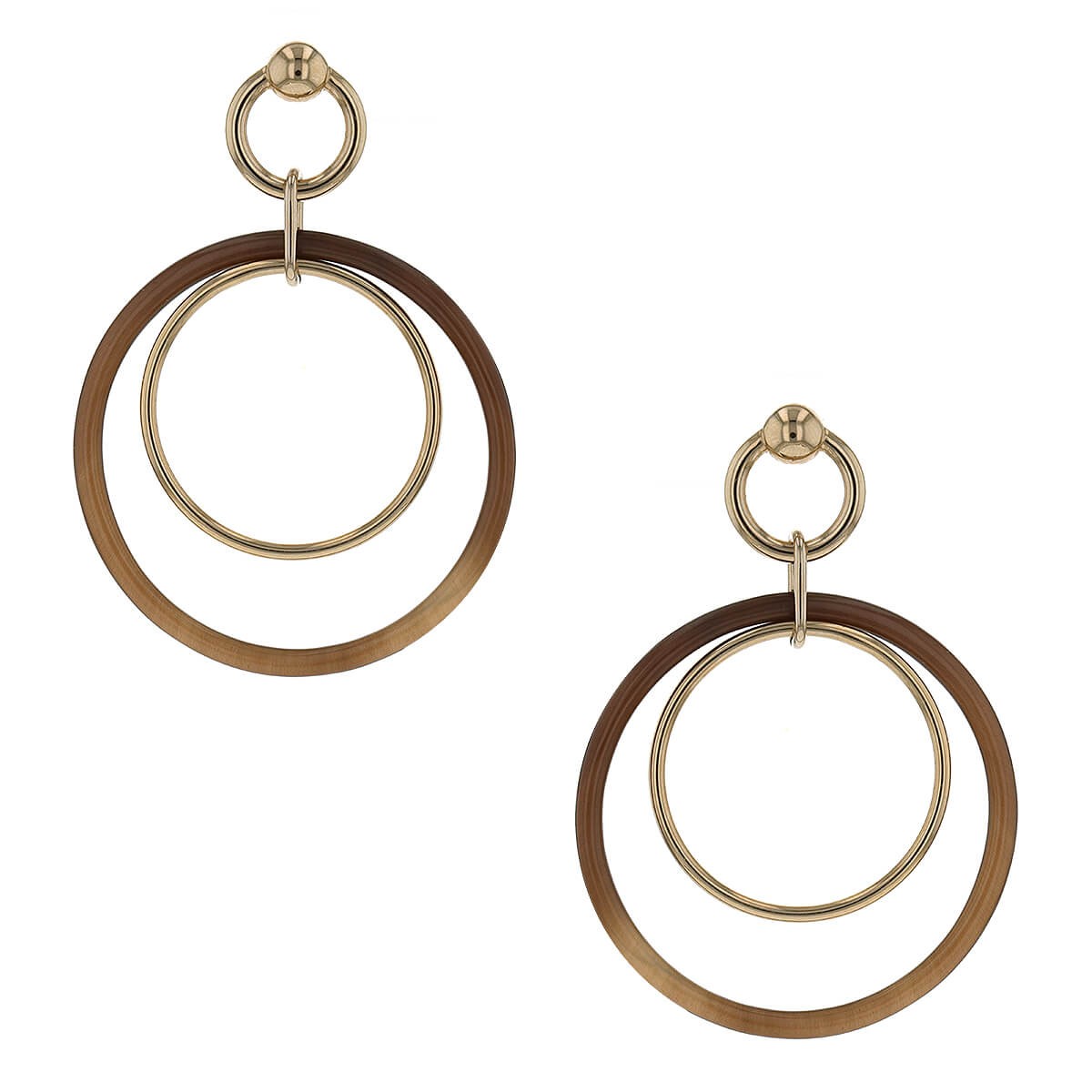 Boucles d’oreilles en métal doré, retenant en pendentifs deux anneaux en corne de buffle et en métal doré. Signées.