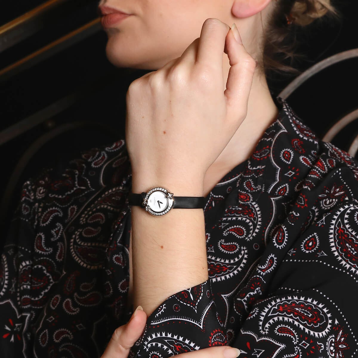 Montre bracelet de femme en acier, cadran blanc avec index diamant à 12h, lunette ornée de diamants et ponctuée de trois motifs de fleurs centrées d’un diamant. Mouvement quartz. Bracelet signé en tissu noir doublé cuir avec boucle ardillon stylisée en acier. Signée et numérotée.