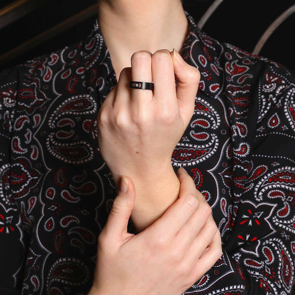 Bague en titane, à décor ajouré orné d’un diamant mobile. Signée et numérotée.