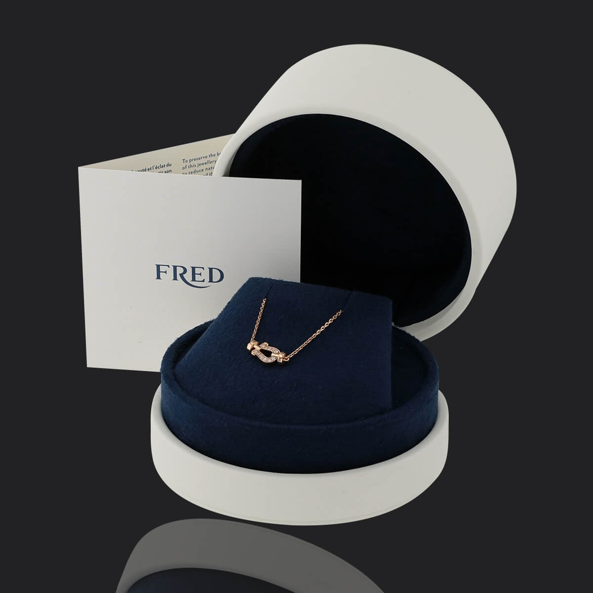 Collier petit modèle en or rose, maille forçat, orné d’un motif stylisant une manille pavée de diamants, agrémenté d’un fermoir mousqueton avec longueur réglable. Signé et numéroté.