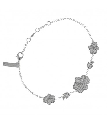 Bracelet en or blanc, maille jaseron, ponctué de motifs de fleurs sertis de diamants, agrémenté d’un fermoir mousqueton avec longueur réglable. Signé.