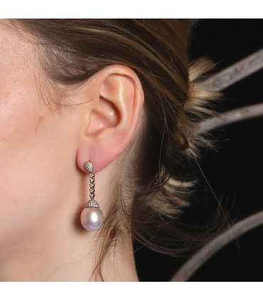 Boucles d’oreilles en or rose, serties d’une ligne de diamants retenant une perle de culture en goutte de 12 x 16 mm, ornées de diamants.