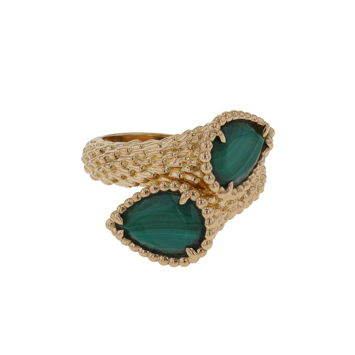Bague en or jaune petit modèle, à décor d’écailles stylisant un motif en toi et moi rehaussé de malachites taillées en poire dans un entourage perlé. Signée et numérotée.