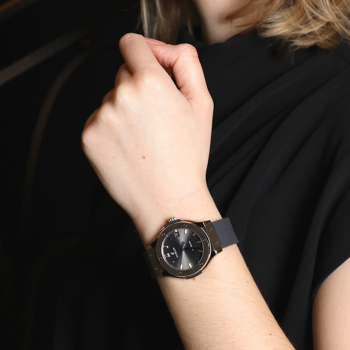 Montre bracelet en titane, cadran gris avec index appliqués, affichage de la date par guichet à 3 heures, lunette stylisée à décor de vis. Fond de boîte transparent dévoilant son mouvement automatique. Bracelet en caoutchouc gris avec boucle déployante réglable en acier. Signée et numérotée.