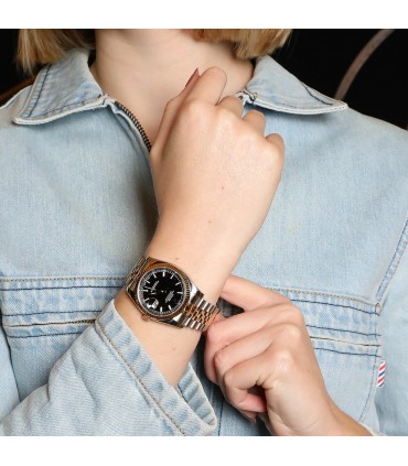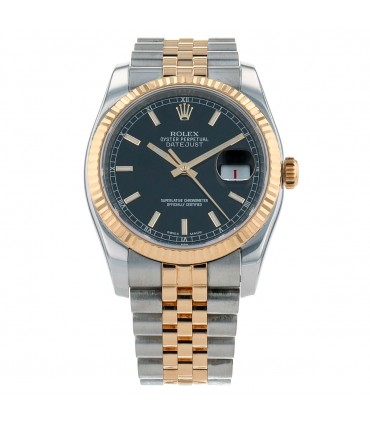 Montre bracelet en or jaune et acier, cadran noir avec index appliqués, chemin de fer pour les minutes, affichage de la date par guichet à 3 heures, lunette cannelée en or jaune. Mouvement automatique. Bracelet or jaune et acier, maillons jubilé avec boucle déployante réglable en acier. Signée et numérotée.