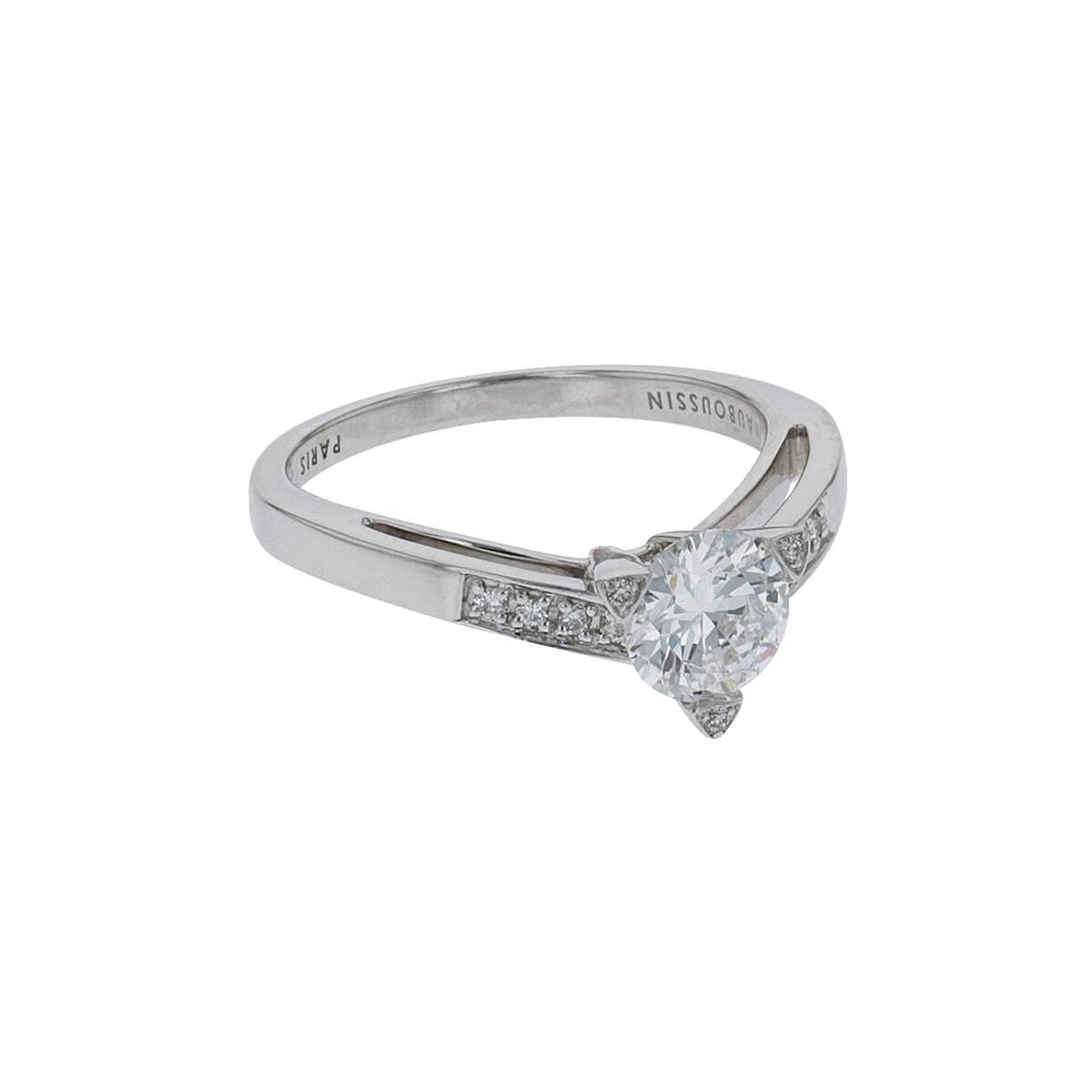 Bague en or blanc, ornée d’un diamant d’environ 0,70 ct dans un entourage de 3 diamants et épaulé de deux lignes de diamants. Signée et numérotée.