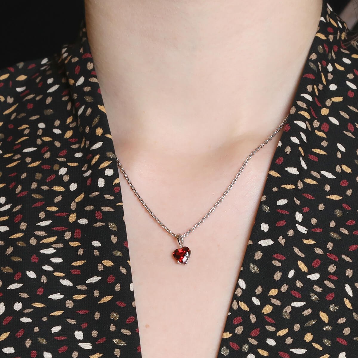 Collier en or blanc, maille forçat retenant en pendentif un grenat taille coeur en serti griffes, agrémenté d’un fermoir à cliquet avec huit de sécurité.