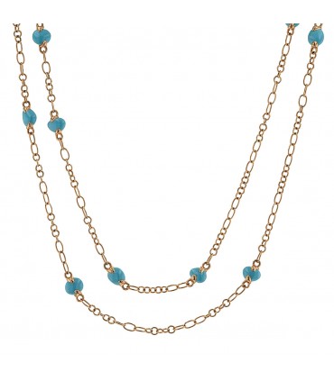 Sautoir en or rose, petit modèle, composé d’une maille ovale ponctuée de 12 cabochons de céramique turquoise, agrémenté d’un fermoir mousqueton. Signé et numéroté.