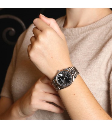 Montre bracelet en acier, cadran noir rayonnant avec index diamants, affichage de la date par guichet à 3 heures, lunette cannelée en or blanc. Mouvement automatique. Bracelet en acier, maillons jubilé avec boucle déployante réglable en acier. Signée et numérotée.