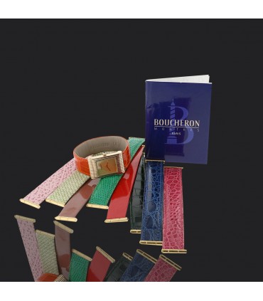 Montre bracelet de femme en or jaune, cadran doré stylisé, lunette godronnée. Mouvement quartz. Bracelet interchangeable en crocodile orange avec fermoir invisible à glissière. Signée et numérotée. Accompagnée de 9 bracelets supplémentaires signés de couleurs rose, bleu, vert, rouge, doré et marron.