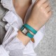 Montre bracelet de femme en acier, petit modèle, cadran argenté avec chiffres arabes, lunette stylisée. Mouvement quartz. Bracelet signé en cuir bleu double rang avec boucle ardillon en acier. Signée et numérotée.