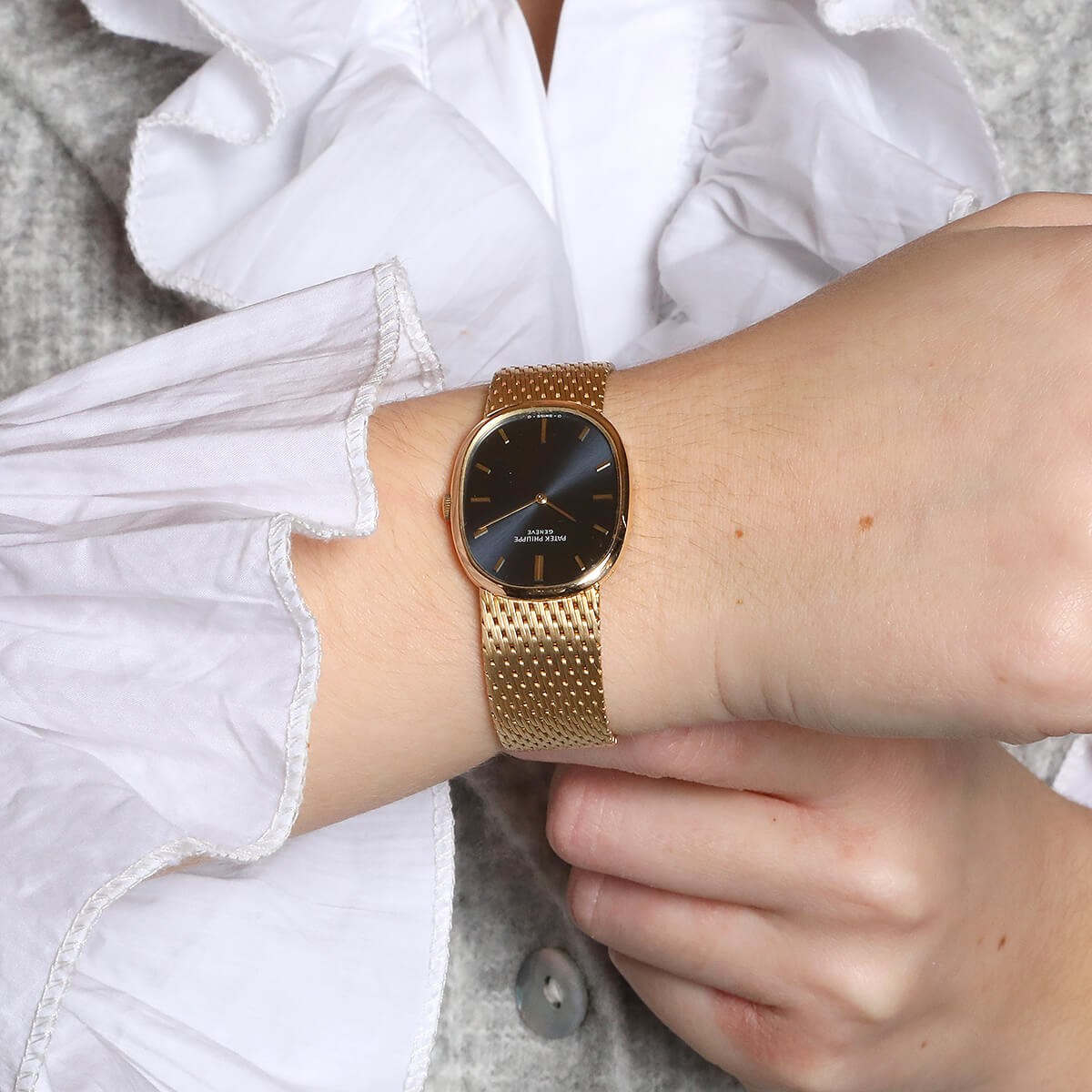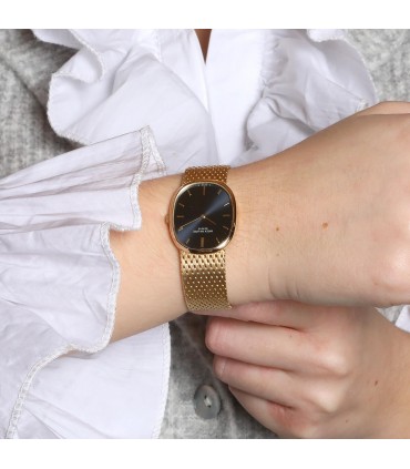 Montre bracelet en or jaune, cadran bleu rayonnant avec index appliqués. Mouvement mécanique. Bracelet en or jaune, maillons souples agrémenté d’un fermoir à cliquet en or jaune. Signée et numérotée.