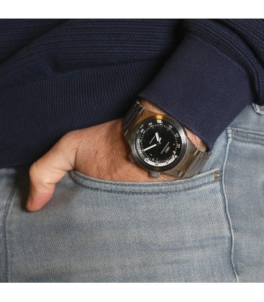 Montre en acier, cadran noir avec index appliqués, affichage de la date par guichet à 3 heures, lunette tournante. Mouvement automatique. Bracelet en acier avec boucle déployante en acier. Signée et numérotée.