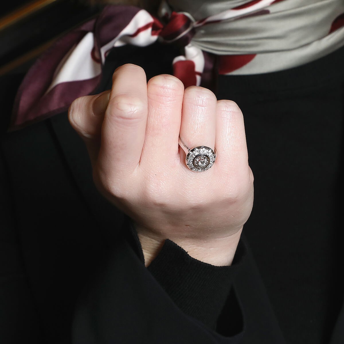 Bague en or blanc et platine, centrée d’un motif rond serti de diamants taille ancienne.