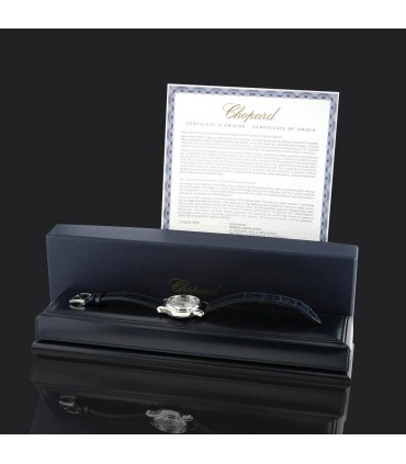 Montre bracelet de femme en acier, cadran argenté partiellement guilloché avec chiffres romains et index appliqués retenant 5 diamants mobiles. Mouvement automatique. Bracelet en crocodile bleu avec boucle ardillon en acier. Signée et numérotée.