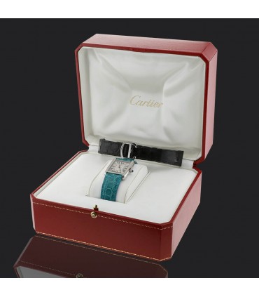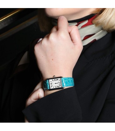 Montre bracelet en acier, cadran argenté avec chiffres romains peints et chemin de fer pour les minutes. Mouvement quartz. Bracelet en cuir bleu avec boucle ardillon en acier. Signée et numérotée.