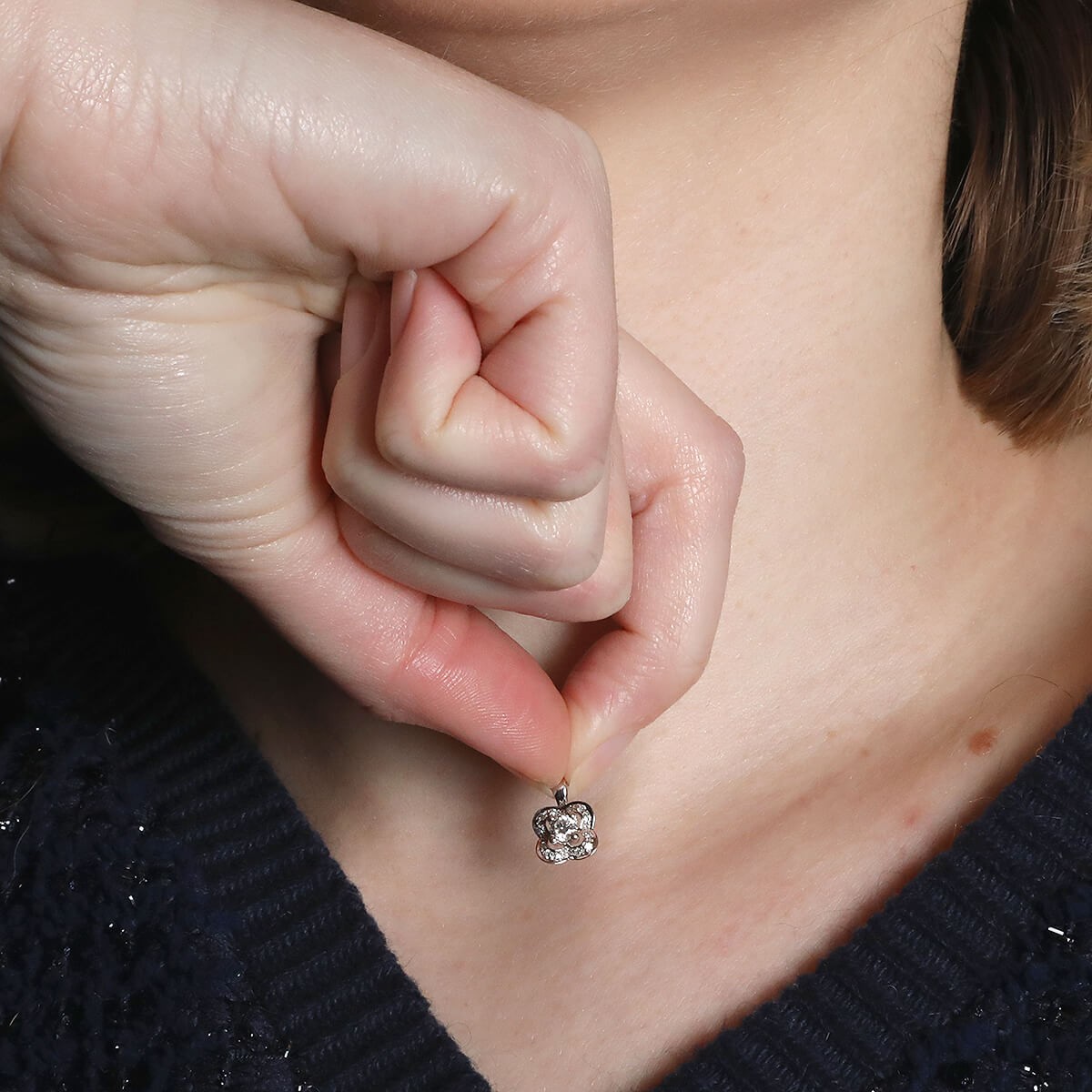 Pendentif en or blanc, orné d'un diamant de 0,20 ct env. entouré d'un motif polylobé diamanté. Non signé.