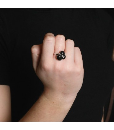 Bague en or blanc, ornée de trois cabochons en céramique noire rehaussés de diamants ronds facettés. Signée et numérotée.