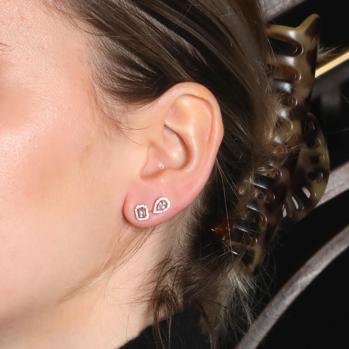 Boucles d’oreilles en or rose, serties chacune d’un diamant taille émeraude dans un entourage de diamants, épaulé pour l’une d’un diamant taille poire entouré de diamants. Signées et numérotées.