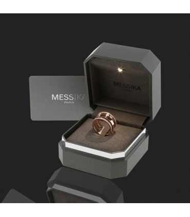 Bague en or rose grand modèle, composée d’une micro alliance diamants, d’un anneau simple et d’une alliance ornée de diamants, l’ensemble rehaussé de 3 diamants en serti clos dont un mobile. Signée et numérotée.