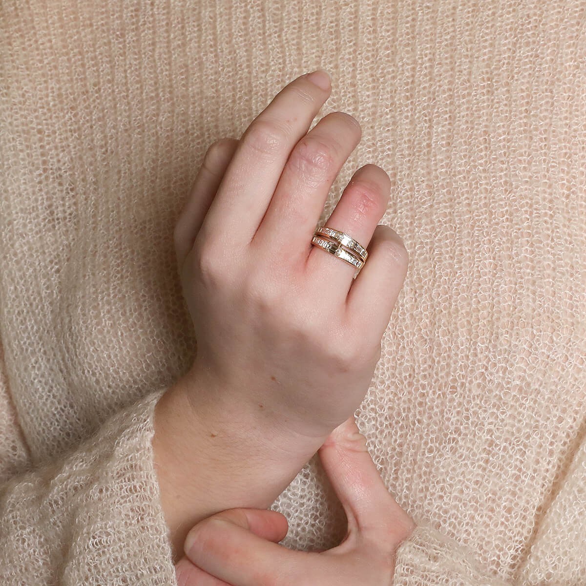 Bague en or jaune, centrée de deux rangs sertis de diamants taille baguette.