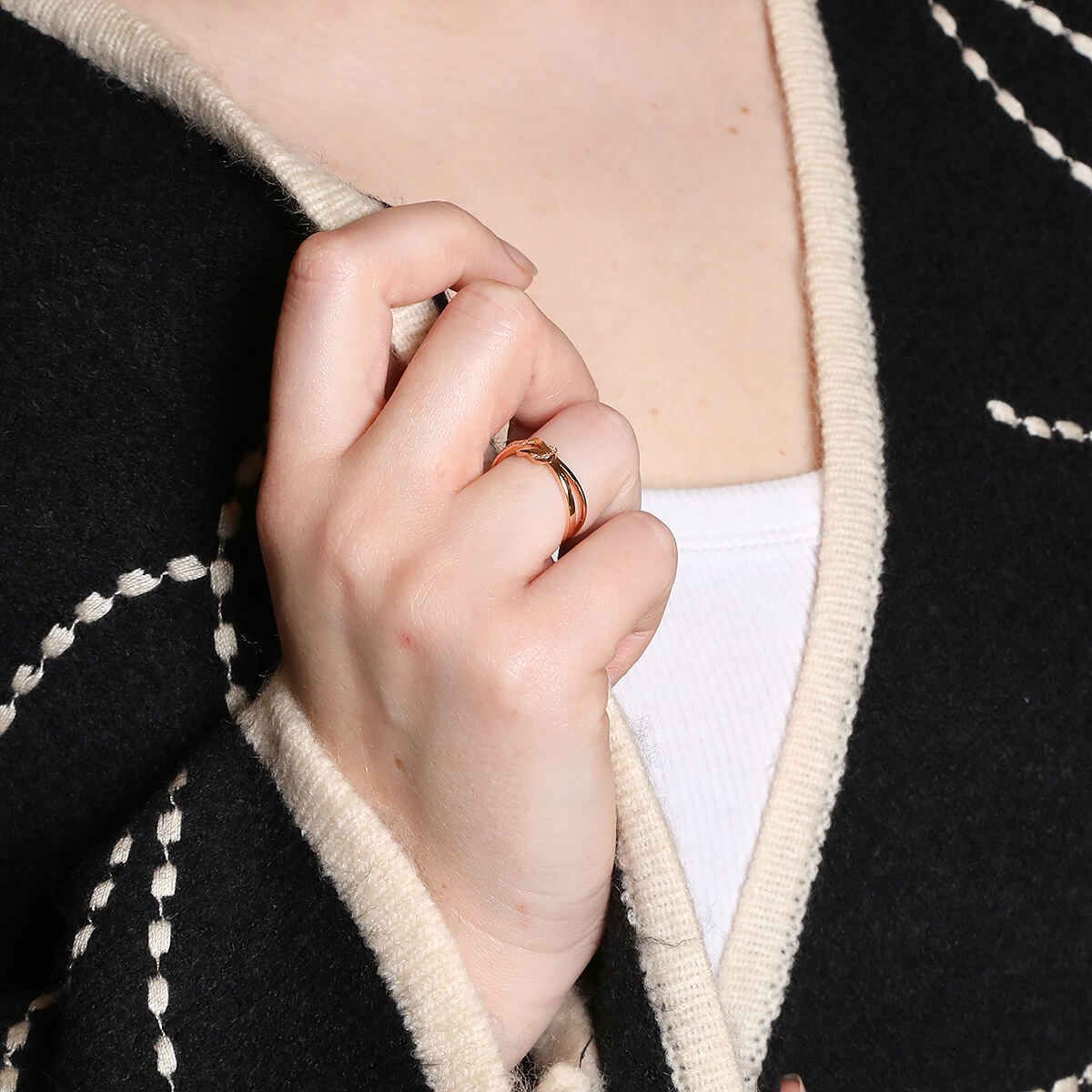 Bague petit modèle en or rose, stylisant un motif noeud d’hercule rehaussé d’un pavage partiel de diamants. Signée et numérotée.